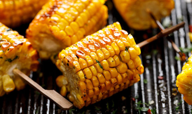 3.茹でたとうもろこしを3等分し、気をつけながら中心に竹串を刺す