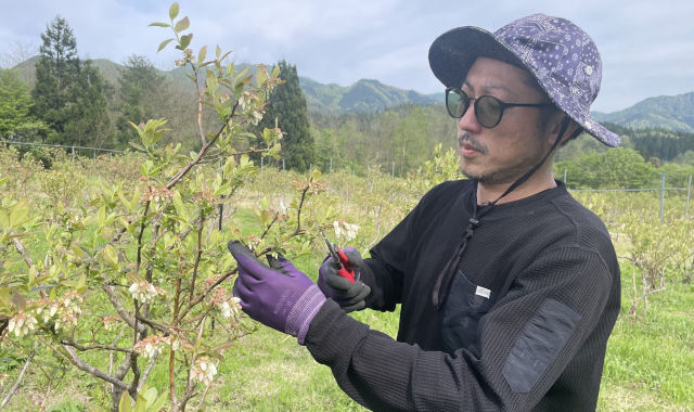 奥羽山脈の麓に流れる清らかな水を使ってブルーベリーとシャインマスカットを栽培しています。シャインマスカットを求めて、県内外から多くのご注文をいただいています。