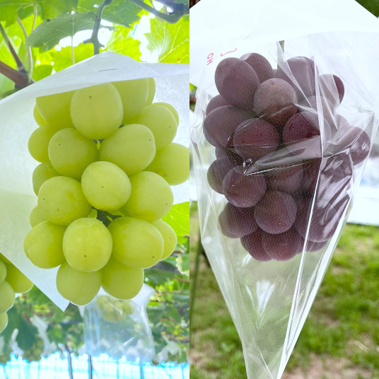 マスカ・サーティーンとBKシードレスの食べ比べセットです。マスカ・サーティーンはシャインマスカットを親に持つ葡萄で、マスカット香・酸味・甘味の調和が特徴です。瑞々しさが口いっぱいに広がる葡萄です。BKシードレスの最大の特徴はもともと種がない品種です。九州大学が育成し、親は「マスカットベリーA」と「巨峰」です。味は酸味が少なく甘味が強く巨峰のような香りがあります。