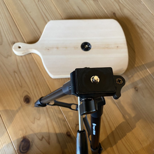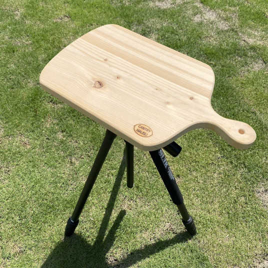 そんな現場の声から生まれたのが、この「さいどまないた」です。もとはシンプルなカッティングボード。それに三脚に取り付けるための金具を備えたことで、サイドテーブルや簡易テーブルとしても活用できるよう進化しました。