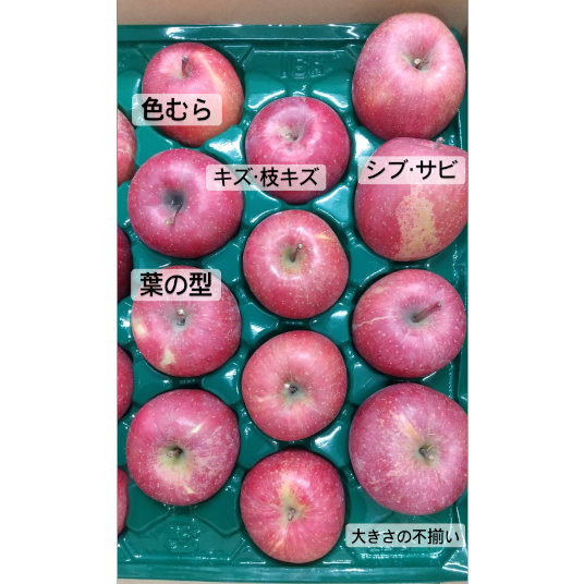 傷・しぶ・つるなし・色薄・葉型・変形・つぶれなどの訳ありのりんごが入ります。サイズは大小さまざまです。