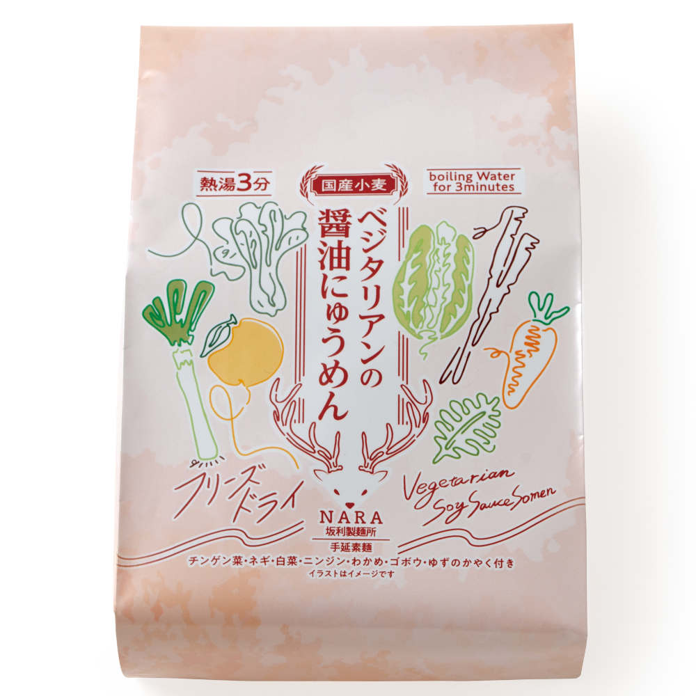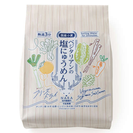 国産小麦100%の手延べそうめんをゆがき、美味しい状態をフリーズドライにしています。動物性原料不使用のスープ、かやくがセットになっている、400㏄のお湯をかけて3分待つだけの即席にゅう麺です。
