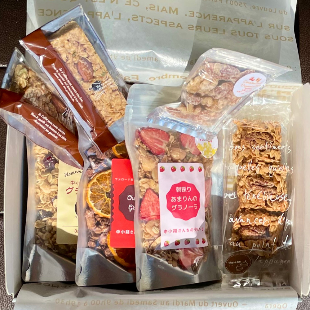 オリジナルグラノーラ(小)、季節のグラノーラ2種(その季節に作っているものの中から2種)の小パック各1個、栗とピーカンナッツのグラノーラクッキー1個、グラノーラバー2本、オーガニックナッツのキャラメリゼ1個