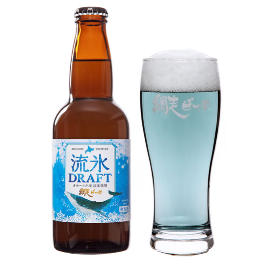 流氷ドラフト…流氷を仕込み水に使用。鮮やかなブルー色の発泡酒。