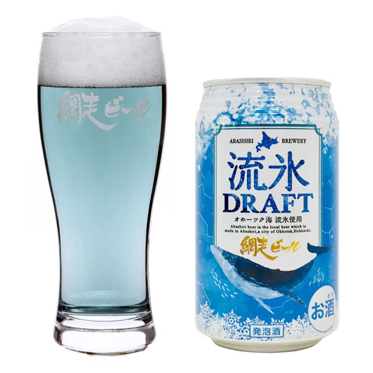 流氷ドラフト…網走の冬の風物詩・流氷を仕込み水に使用した、鮮やかなブルー色の発泡酒。
