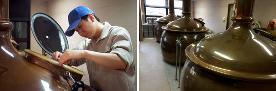 網走ビールでは、釜を3つ使用する「三釜方式」と、ドイツの伝統的な製法「デコクション法」を組み合わせて醸造しています。もろみの煮沸と加熱を行う「デコクション法」は、通常は釜を2つしか使用しませんが、釜が3つあることで麦芽以外の副原料を加えることができ、今までにない斬新な発泡酒を作り上げています。