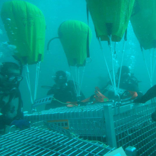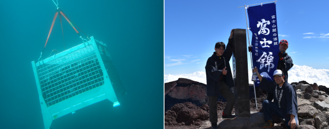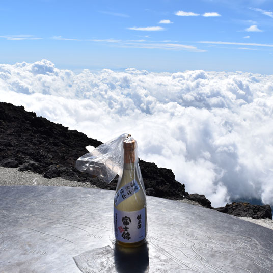 駿河湾の海底と、富士山でそれぞれ貯蔵されたお酒です。海底で貯蔵したお酒は、摂氏14度の海底で常に海流にさらされ揺り動かされます。一方、富士山では厳冬期にはマイナス30度を超える過酷な環境の中で貯蔵されました。海中への保管は潜水士の方の協力に協力してもらい11月から翌年6月まで、富士山頂には社員自らが担いで登り9月から翌年7月まで、それぞれ安全な場所で貯蔵しています。