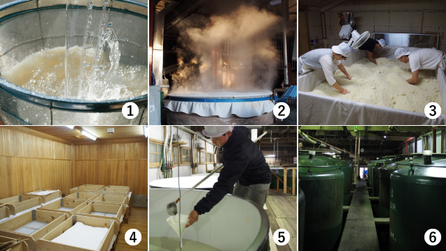 ①洗米・浸漬(しんせき):米の表面についた糠(ぬか)を綺麗な水で洗い落とした後、米に水を吸わせます。毎年異なる米の性質を観察し見極めながら、ストップウォッチ片手に秒単位で作業を行います。