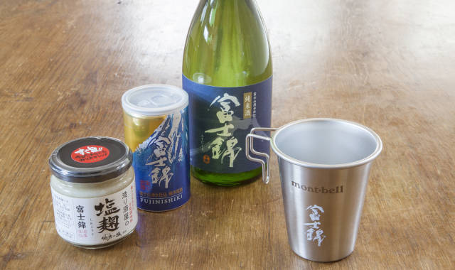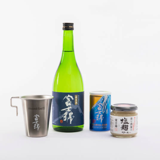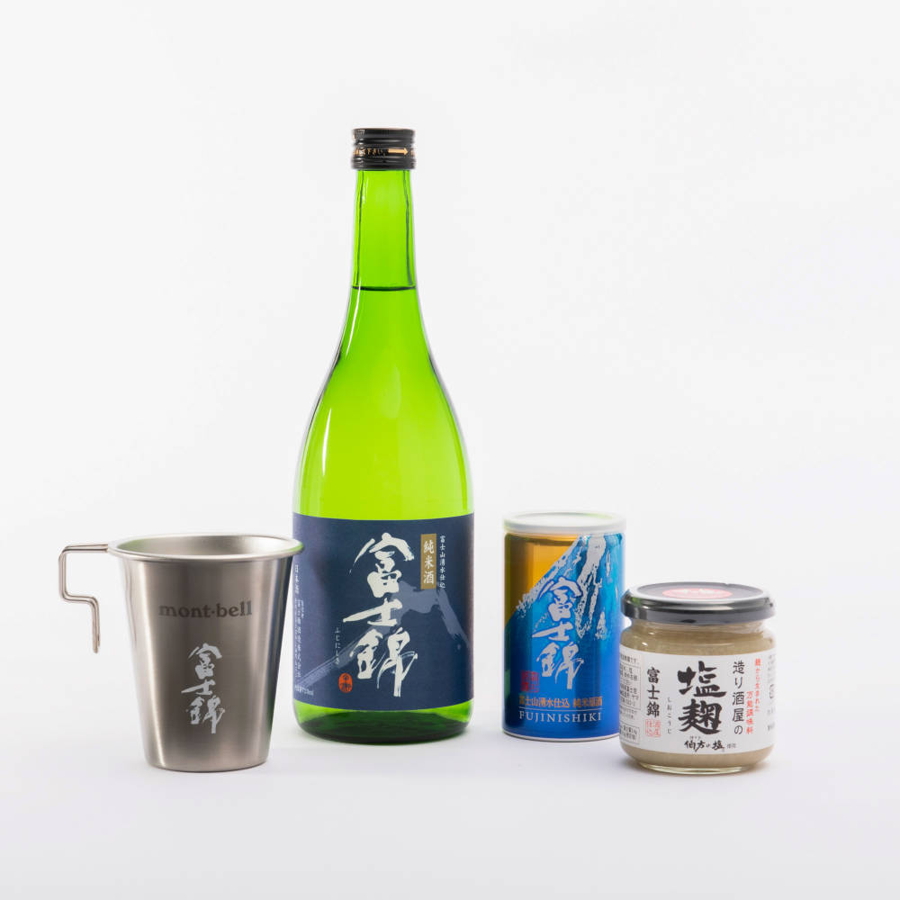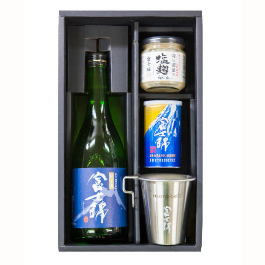 【内容量】純米酒 青ラベル 720mL、純米原酒(缶入)180mL、造り酒屋の塩麹 200g、富士錦オリジナル モンベル製スタッキングステンレスカップ300mL 1個