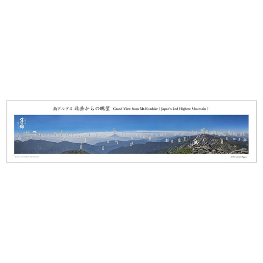 こだわりの原料米のみを使った食中向けのスッキリとした辛口純米酒。蔵元 宮島敏が自ら撮影した南アルプス「北岳」山頂からのパノラマ写真を、商品ラベルの内側に簡単に切り離せるように巻き付けました。そこに、富士山や南アルプスなど、北岳山頂からの景色を高解像度でお楽しみ戴ける横幅1.2メートルの長尺サイズのパノラマ写真をセットにした特別品です。パノラマ写真には、山の名称と標高も記載してありますので、山好きな方への贈り物にいかがでしょうか