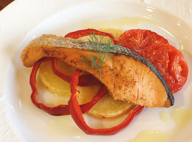 サーモンの皮付きローストに、トマトと赤ピーマンを添えた料理。マグロの洋風刺身やブイヤベースなどがおすすめです。写真はサーモンのロースト。