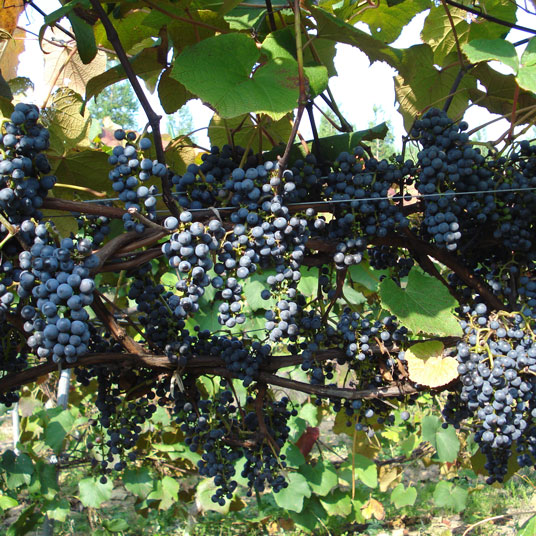 ヤマブドウの自生種は酸味の強さが一番の特徴です。完熟すると程よい酸味が感じられます。 皮が厚く食べられる部分が少ないため、搾汁率が低く果汁は希少なものです。一粒の大きさは8mm~1cm、収穫時期は、9月中旬~下旬。秋空の下に輝く黒紫の粒はまるで山の宝石です。白山ワイナリーではヤマブドウの他にも、甘みと酸味のバランスはが良い「小公子」、野性的な風味と渋味が特徴の「ヤマソーヴィニヨン」などを使用しております。