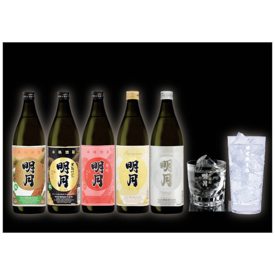 明石酒造の芋焼酎900mL 5種類の飲みくらべが楽しめる、「ロックグラス」と「ソーダ割りグラス」付きのセットです。