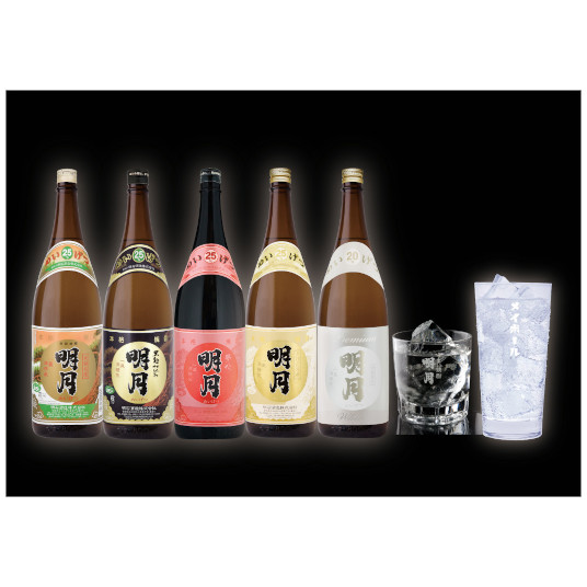 明石酒造の芋焼酎1800mL 5種類の飲みくらべが楽しめる、「ロックグラス」と「ソーダ割りグラス」付きのセットです。