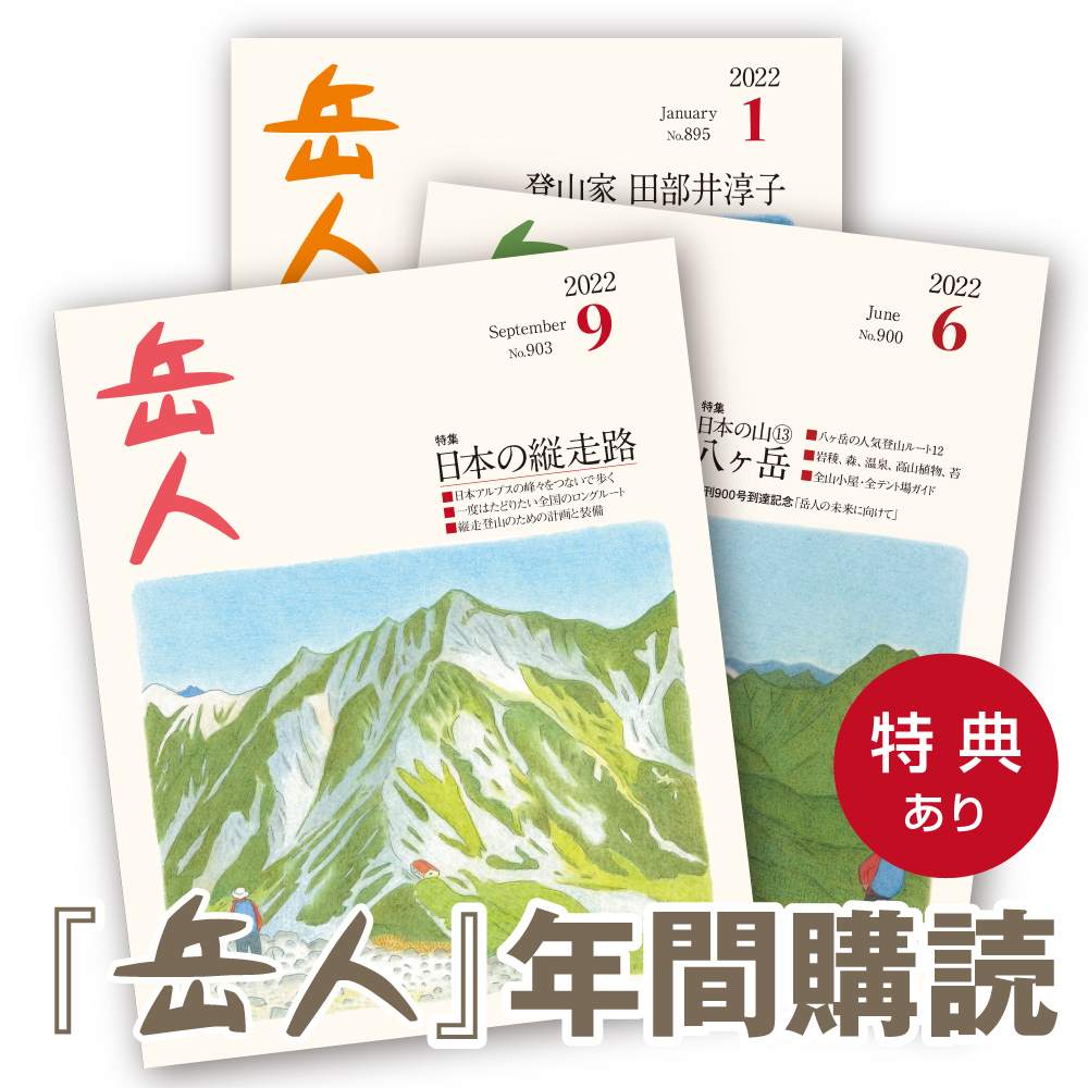 山岳雑誌『岳人』を毎月発売日(計12回)に、お手元にお届けします。新規でお申し込みされる方は、こちらからお手続きください。