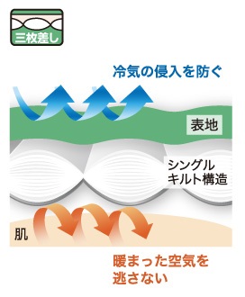 シングルキルト構造に生地をもう1枚加えることで、冷気の侵入を防ぎ、暖まった空気を逃しません。また、表地から裏地まで縫製糸が貫通せず、コールドスポットができにくくなっています。