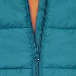 保温材入りウエアのフロントジッパーの裏側にフラップをつけ、ジッパー部分からの冷気の侵入を防ぎ、保温効果を高めています。