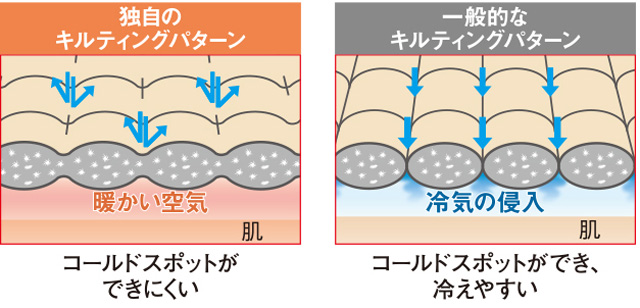 コールドスポットができにくく、暖かさをキープする独自のキルティングパターンです。中綿の片寄りを防ぎ、縫製を少なくすることで軽量化にも貢献しています。