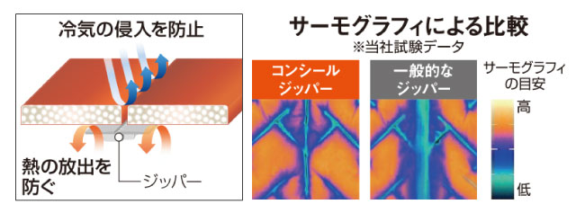 冷気の進入や熱の放出を防ぎ、保温性を高めるジッパーです。表面がフラットになり、雪などが付着しにくくなっています。