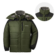 【特長】ダウンプルーフ加工 / ボックス構造 / デュアルアクスルフード / フードは取り外し可能 / アクアテクト®ジッパー / ジッパーがあごに当たらない仕様 / リードイン・コードシステム / アルパインカフ / スタッフバッグ付き