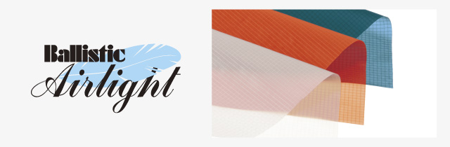 バリスティック エアライト®は、極細の高強力糸(ナイロンまたはポリエステル)を先端技術で織り上げた素材です。十分な強度を備えながらも抜群の軽量性と薄さを実現。軽量・コンパクトをコンセプトに開発される製品に幅広く採用されています。また、製品の特性に応じて、ストレッチ性を付加した素材や、優れた透湿性を備えた素材を使い分けています。