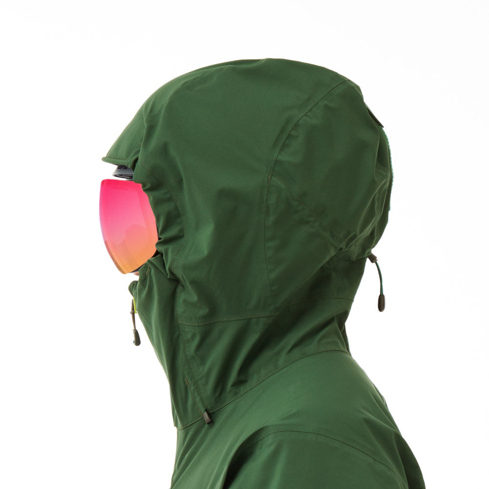 【特長】トライアクスルフード / フィット感を高める独自の立体パターン / 高めの襟元 / ジッパーが顔に当たらない仕様 / 立体裁断(肘) / アルパインカフ / アクアテクト®ジッパー / リードインコード・システム(裾) / リフト券やICチップを入れられる左袖のポケット