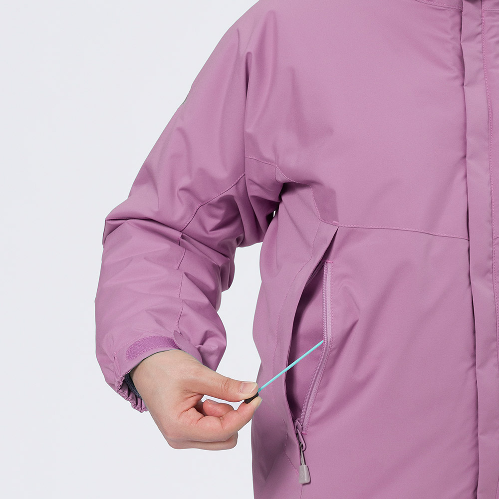表地に防水透湿性に優れるスーパー ドライテック®を使用した、保温材入りパーカ。スキーなどのスノースポーツや雪遊びなどで活躍します。保温材には保温性と速乾性に優れる化繊綿エクセロフト®を使用。フードや裾の調節は、安全面と使いやすさに配慮したオリジナルシステム「ビルトイン・ドローコード・システム」を用いています。汚れたらご自宅で洗濯していただけます。