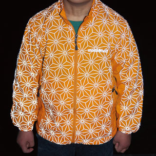 夜間に車のライトなどを反射して光る特殊プリント(リフレック)を全面に施した視認性の高いウインドブレーカーです。付属のスタッフバッグにコンパクトに収納して持ち運べます。