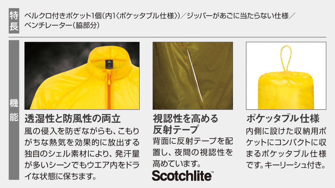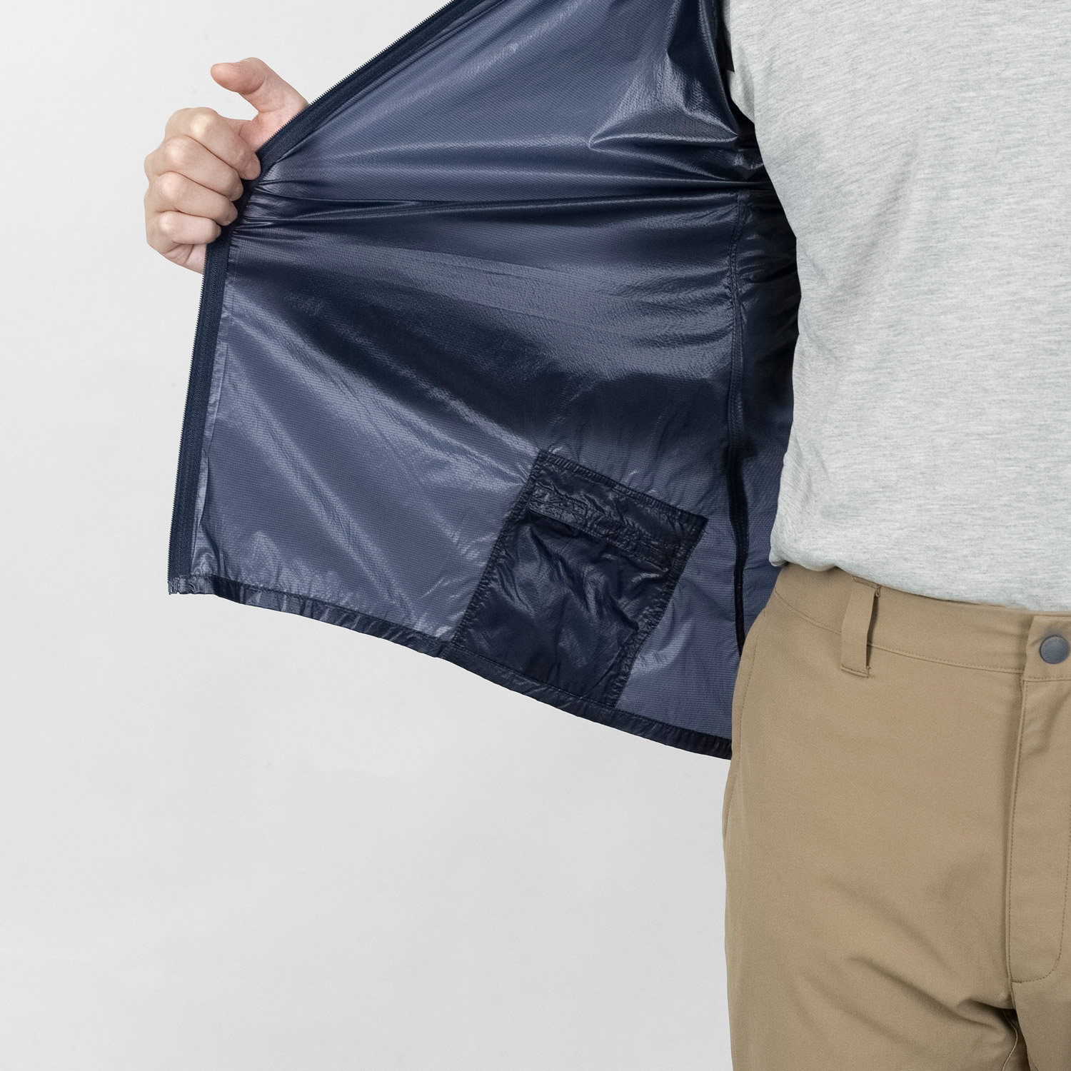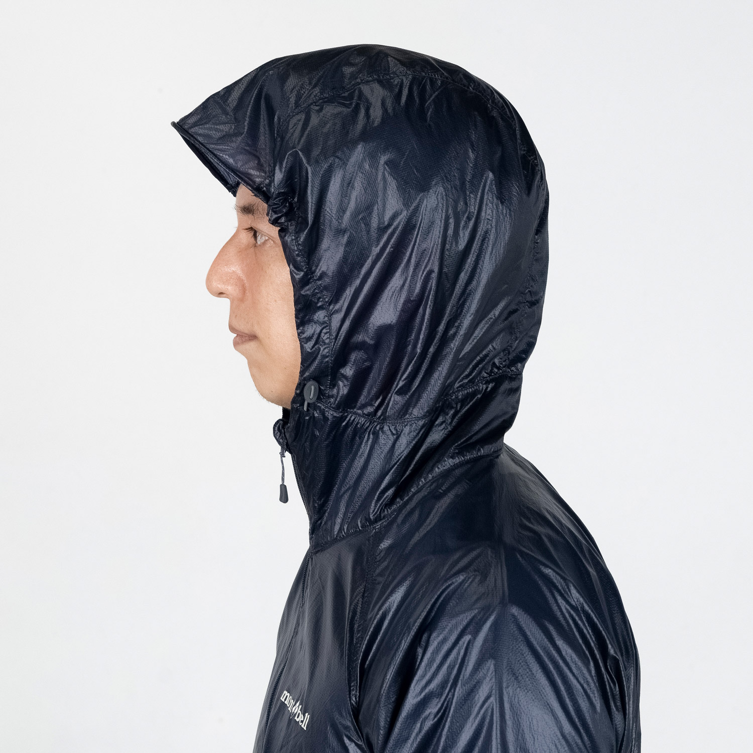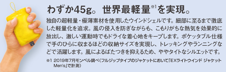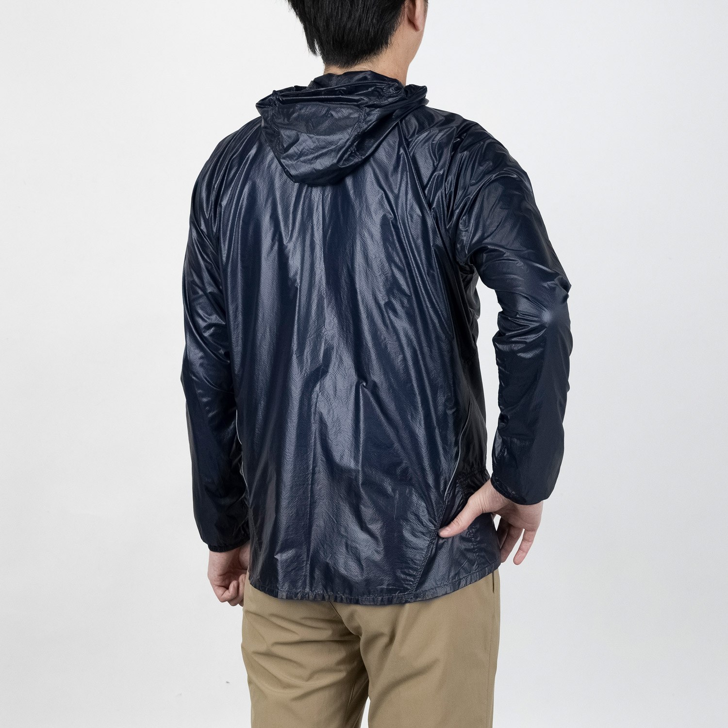 独自の超軽量・極薄素材を使用したウインドシェルです。細部に至るまで徹底した軽量化を追求。風の侵入を防ぎながらも、こもりがちな熱気を効果的に放出し、激しい運動時でもドライな着心地をキープします。ポケッタブル仕様で手のひらに収まるほどの収納サイズを実現し、トレッキングやランニングなどで活躍。風によるばたつきを抑えるため、ややタイトなシルエットです。