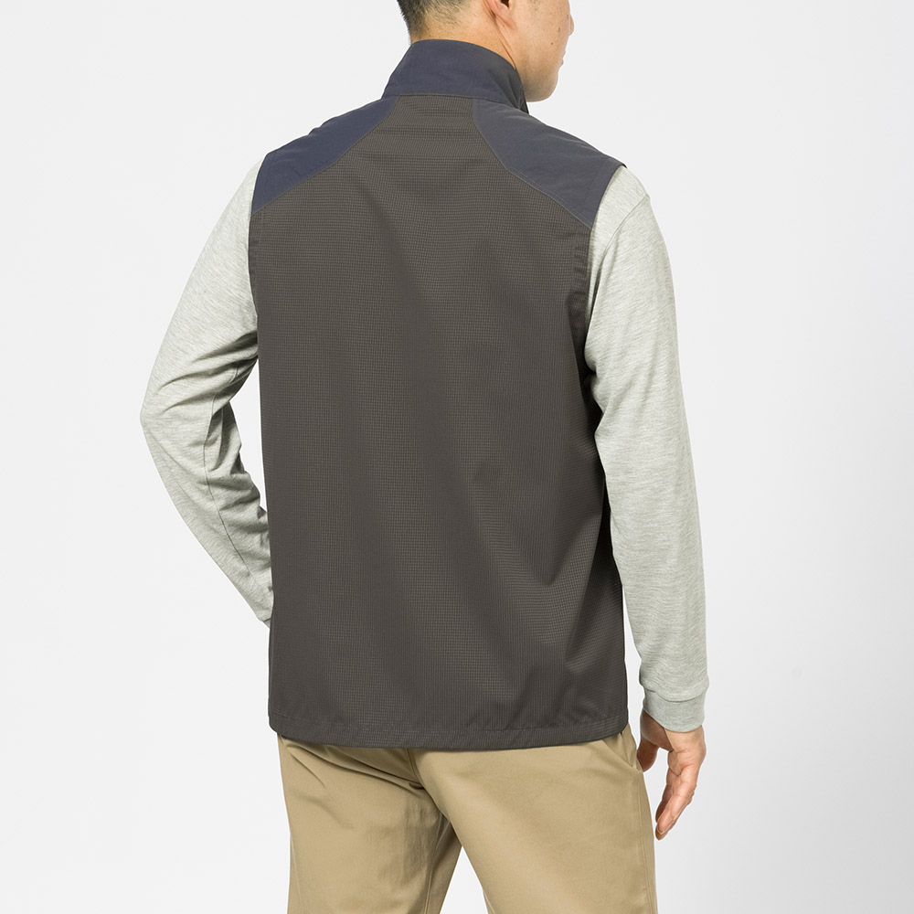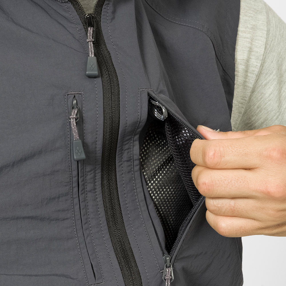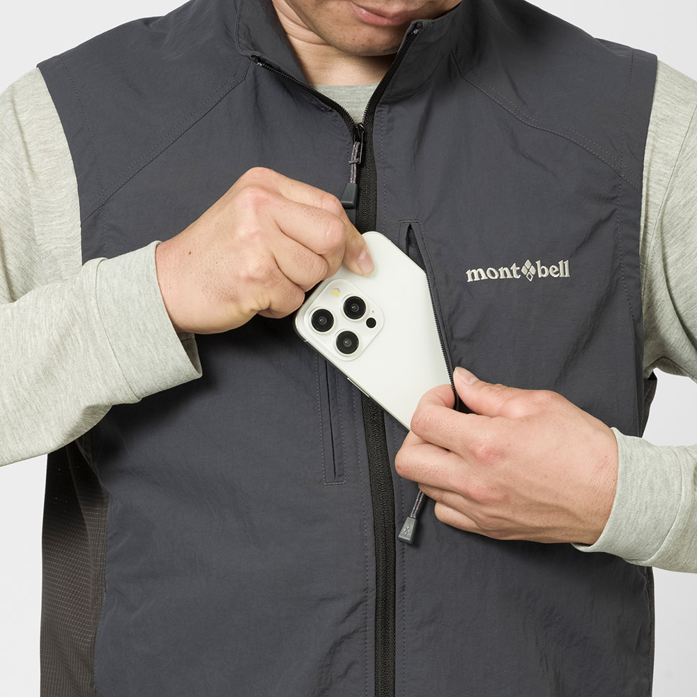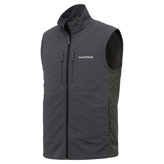 すっきりとしたシルエットのベストです。前面は両胸と両腰の4カ所にポケットを配置。表地は防風性とはっ水性を備えたコットンのような薄手のナイロン地を使用しています。背面から側面にかけて通気性に優れたメッシュ素材を使用することで、蒸れにくく快適な着心地を保ちます。