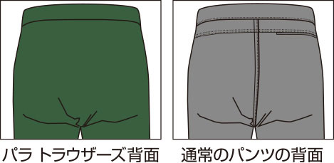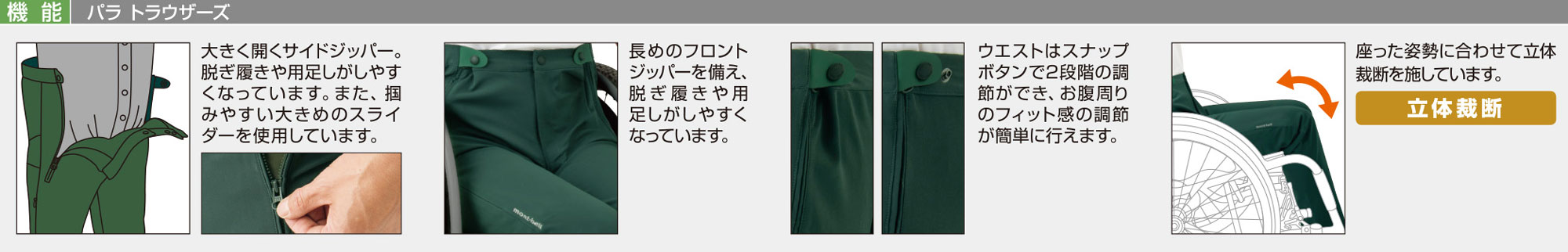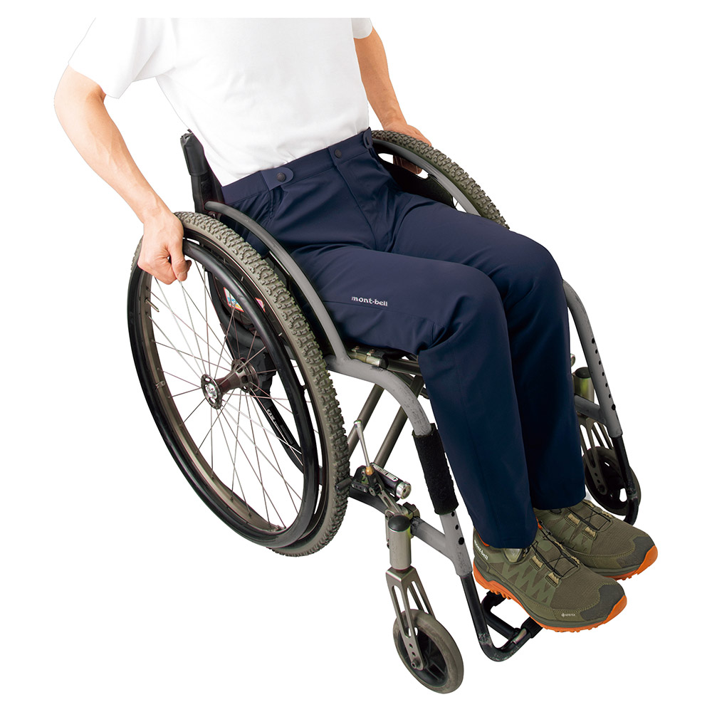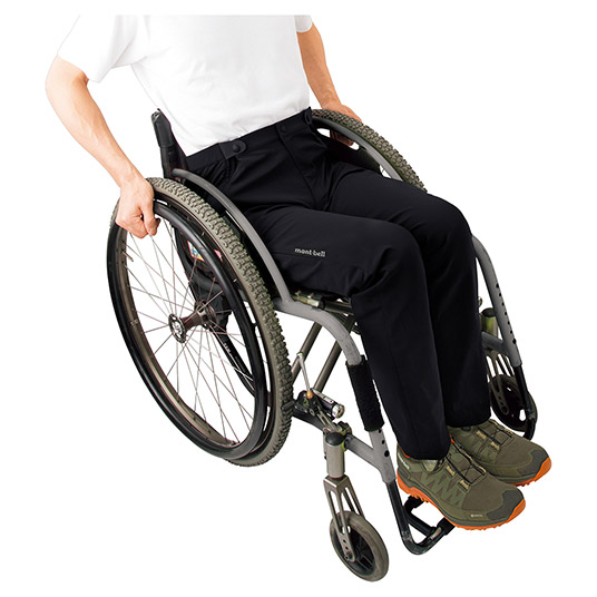 アウトドア用のパンツで培ったノウハウを生かして開発した車椅子用パンツです。長時間座ることを考慮し、尻に縫い目がないパターンを使用。膝部分と尻には座った時にだぶつきが少ない立体裁断を施しています。生地にはストレッチ性に優れた素材を使用し、つっぱり感がない快適な着用感です。はっ水加工を施しているので、小雨程度なら難なく弾き、汚れも付きにくくなっています。