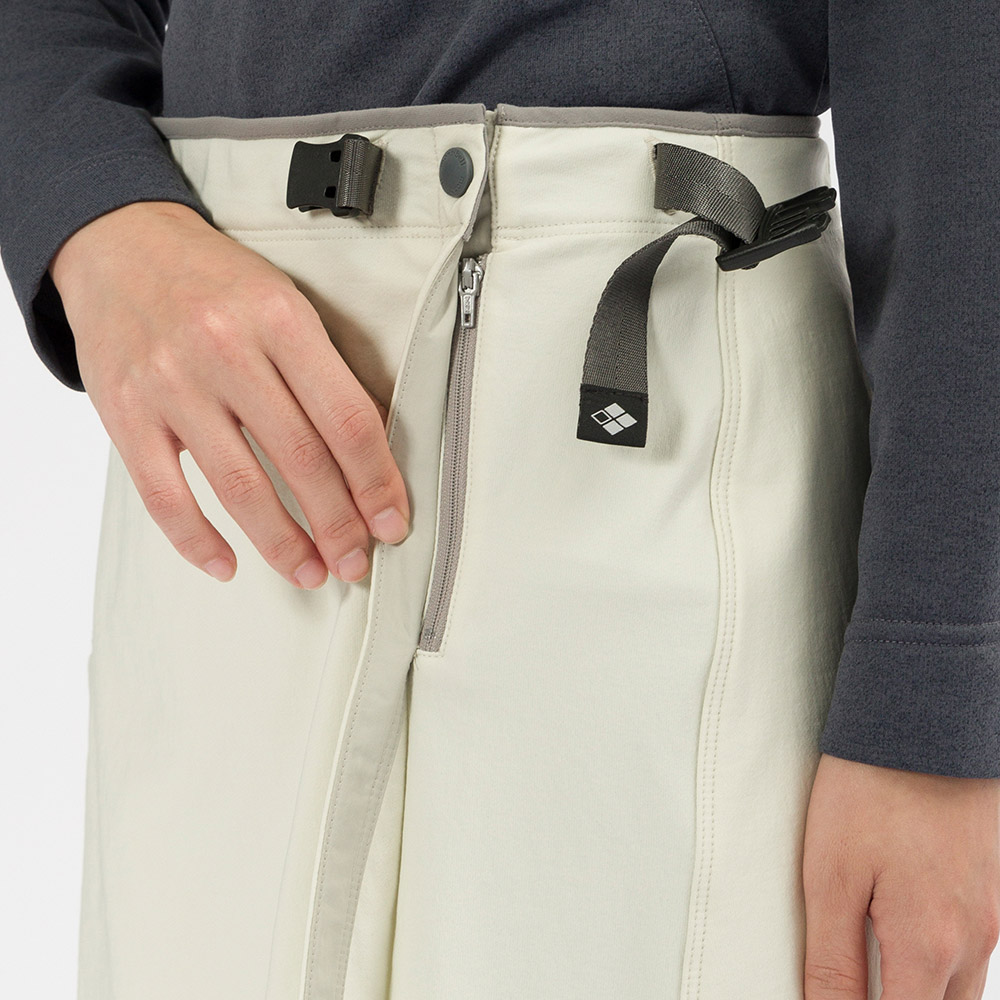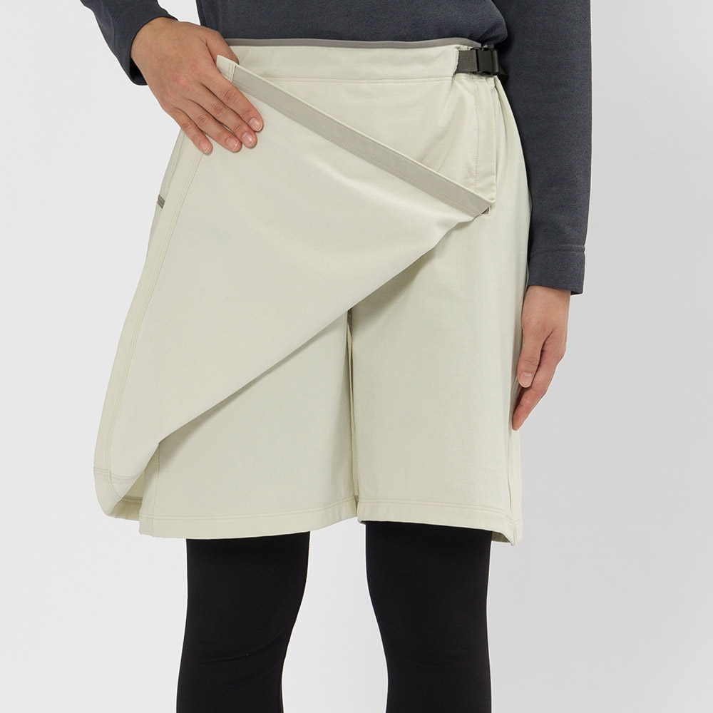 巻きスカートのような表情を持たせたショーツです。高い耐久性と優れた防風性を備え、裏面は速乾性と保温性に優れた起毛地を使用。ストレッチ性に優れ動きやすく、タイツと組み合わせることで、幅広い用途・季節に対応します。ウエストは脇で調節する仕様なので、ベルトを絞っても前面にシワができにくくなっています。