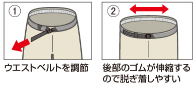 【特長】脱ぎ着しやすいウエストベルト / サムエシステム / フロントジッパーなし / 2WAYストレッチ