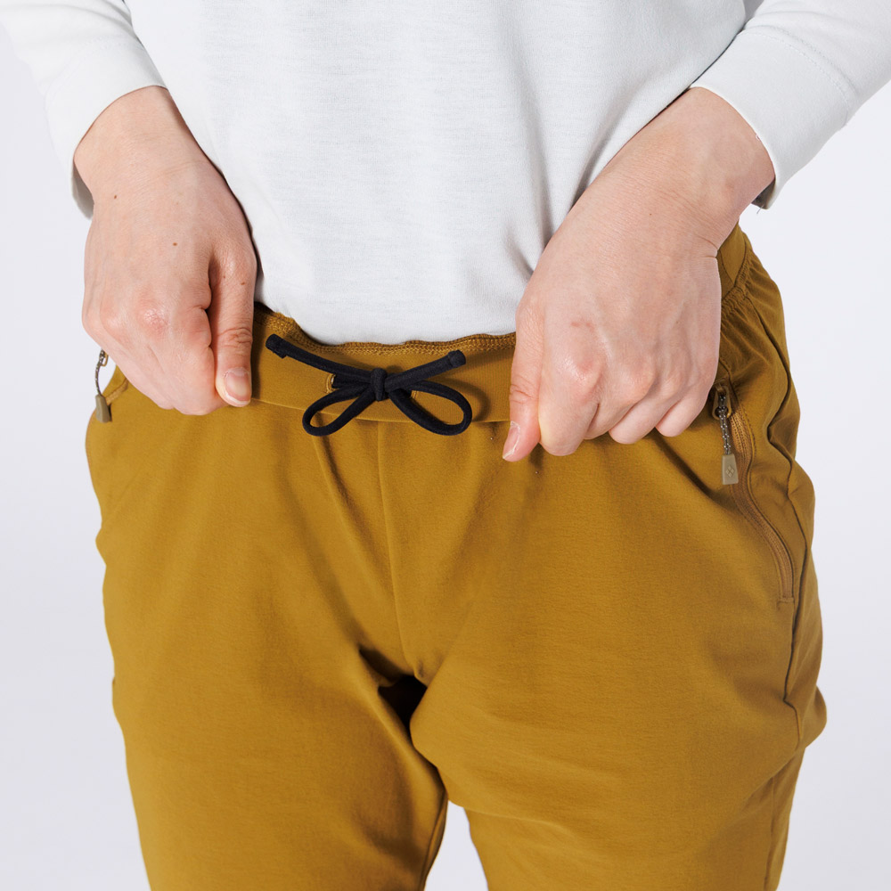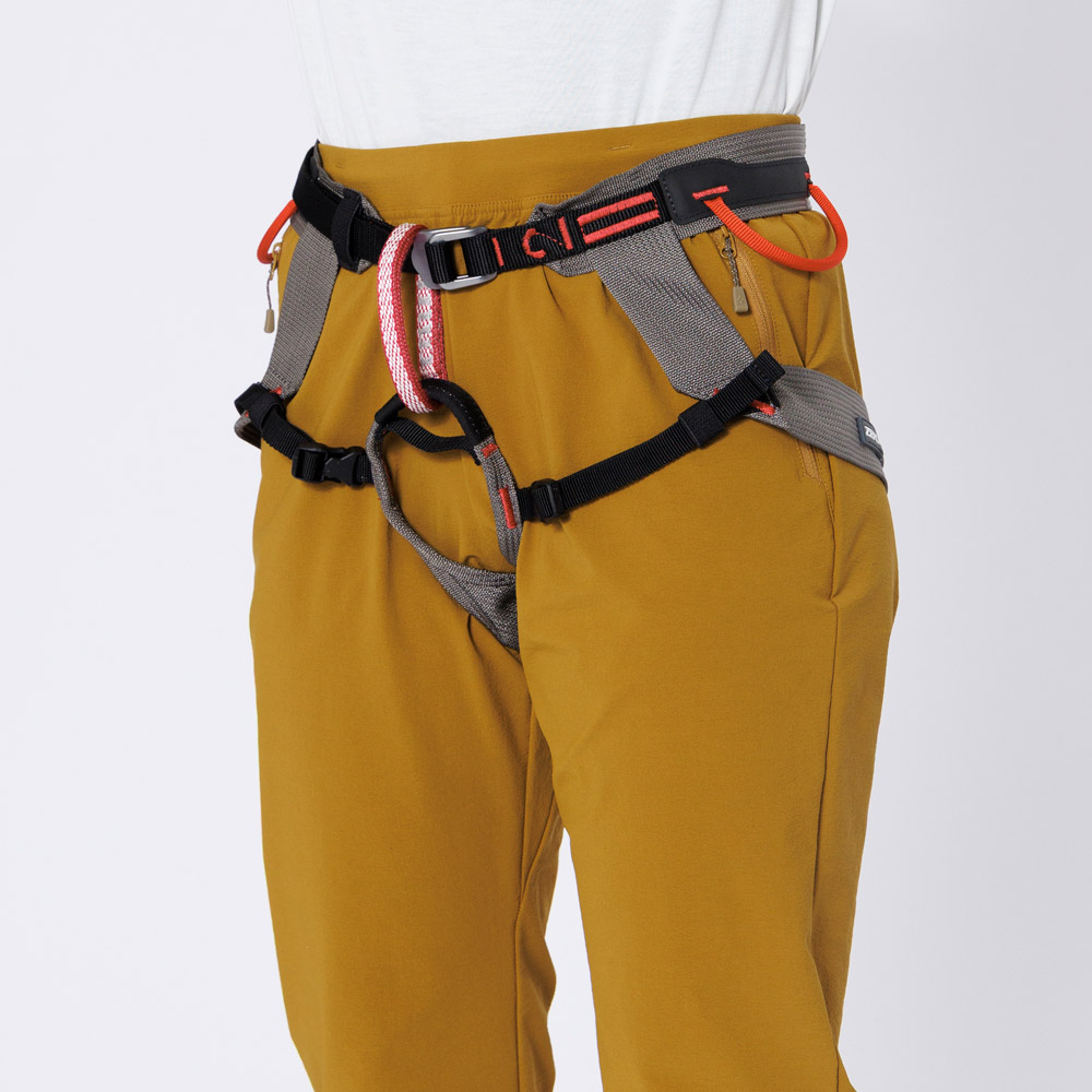 縦横2方向へのストレッチ性と耐摩耗性に優れた素材を使用した薄手のパンツです。ウエストはゴムとひもでフィット感の調節が可能。ウエスト部分にバックルを使用していないのでクライミング用ハーネスに干渉しにくくなっています。軽やかな履き心地で、春から秋の登山やクライミングにおすすめです。