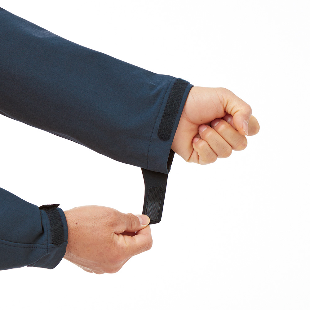 優れたストレッチ性を備えた生地の表裏に、異なる特長を持たせた素材です。表面には防風性とはっ水性に優れた素材、裏面には速乾性と保温性に優れた起毛地を使用し、高い汎用性を備えています。