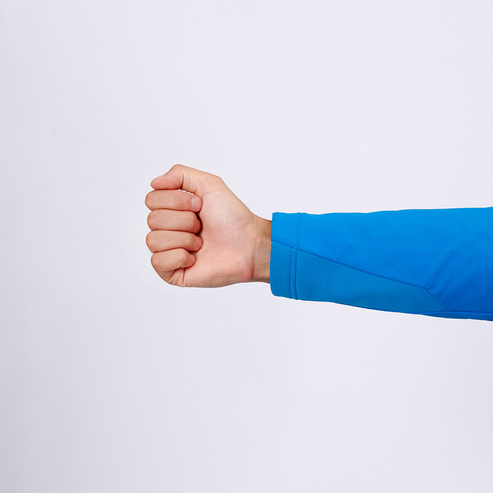 優れたストレッチ性を備えた生地の表裏に、異なる特長を持たせた素材です。表面には防風性とはっ水性に優れた素材、裏面には速乾性と保温性に優れた起毛地を使用し、高い汎用性を備えています。