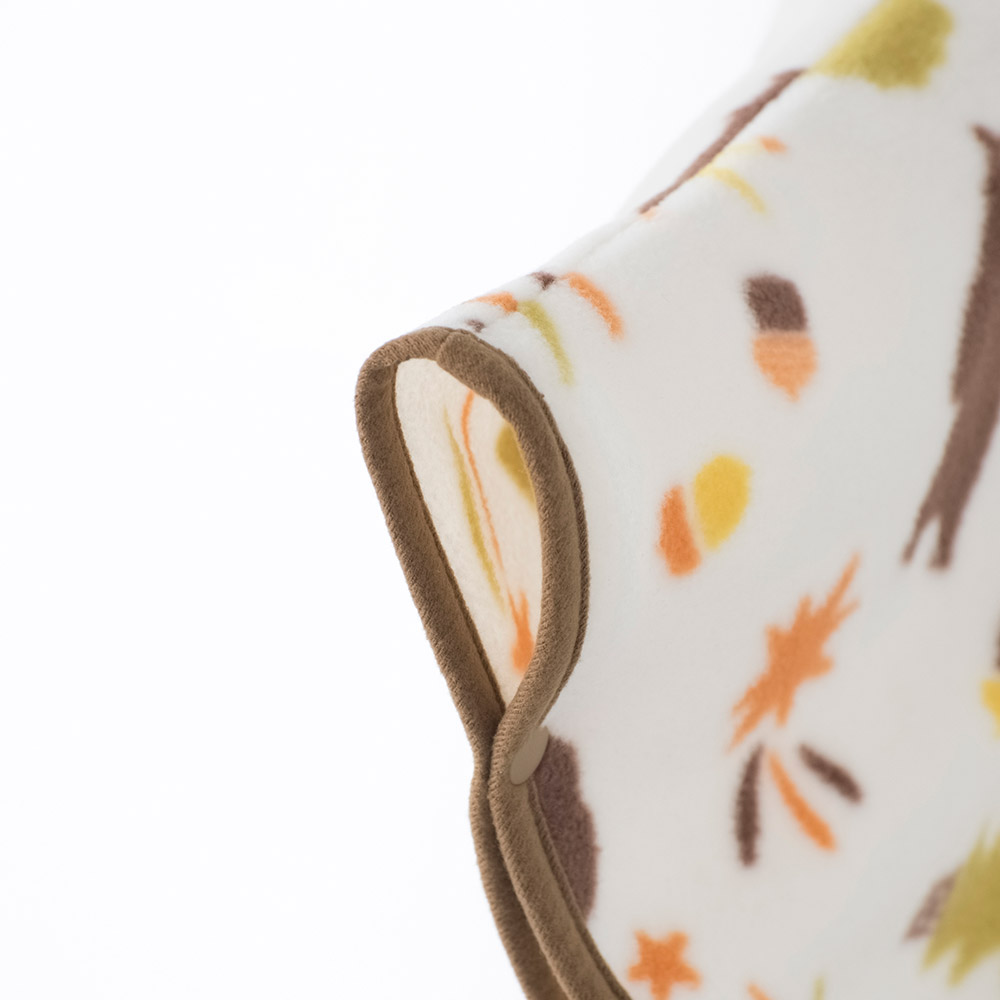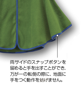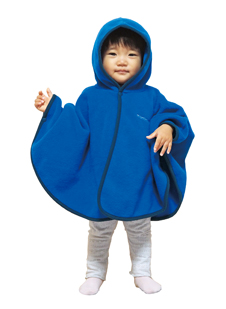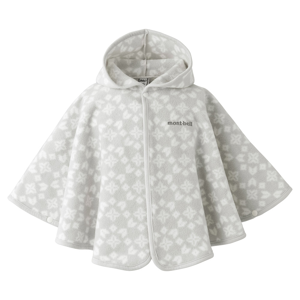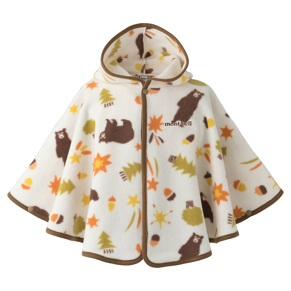 高い保温性とストレッチ性に優れた薄手のフリース素材「クリマプラス®100」を使用した、軽くて暖かいプリント柄のマントです。脱ぎ着はスナップボタンで簡単に行え、おくるみのように使用したり、お出掛けの際に羽織らせたりと、成長に合わせた使い方が可能です。全身を覆うゆったりとしたサイズ。サイドのスナップボタンを留め、手を出すと、手が隠れなくなる仕様なので、歩き始めたお子さまの万が一の転倒の際にも、地面に手をつく動作を妨げません。