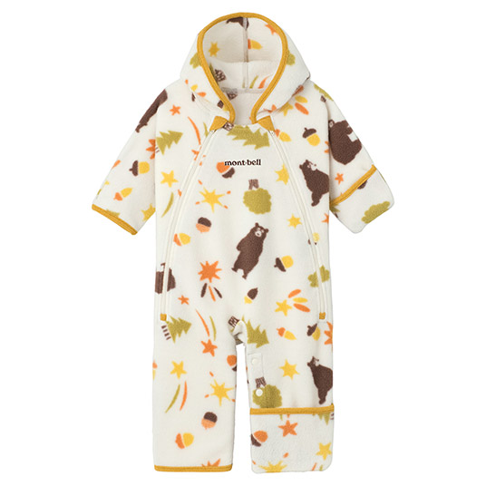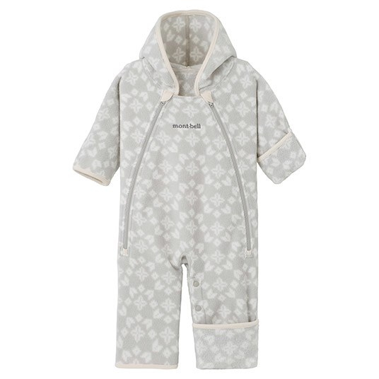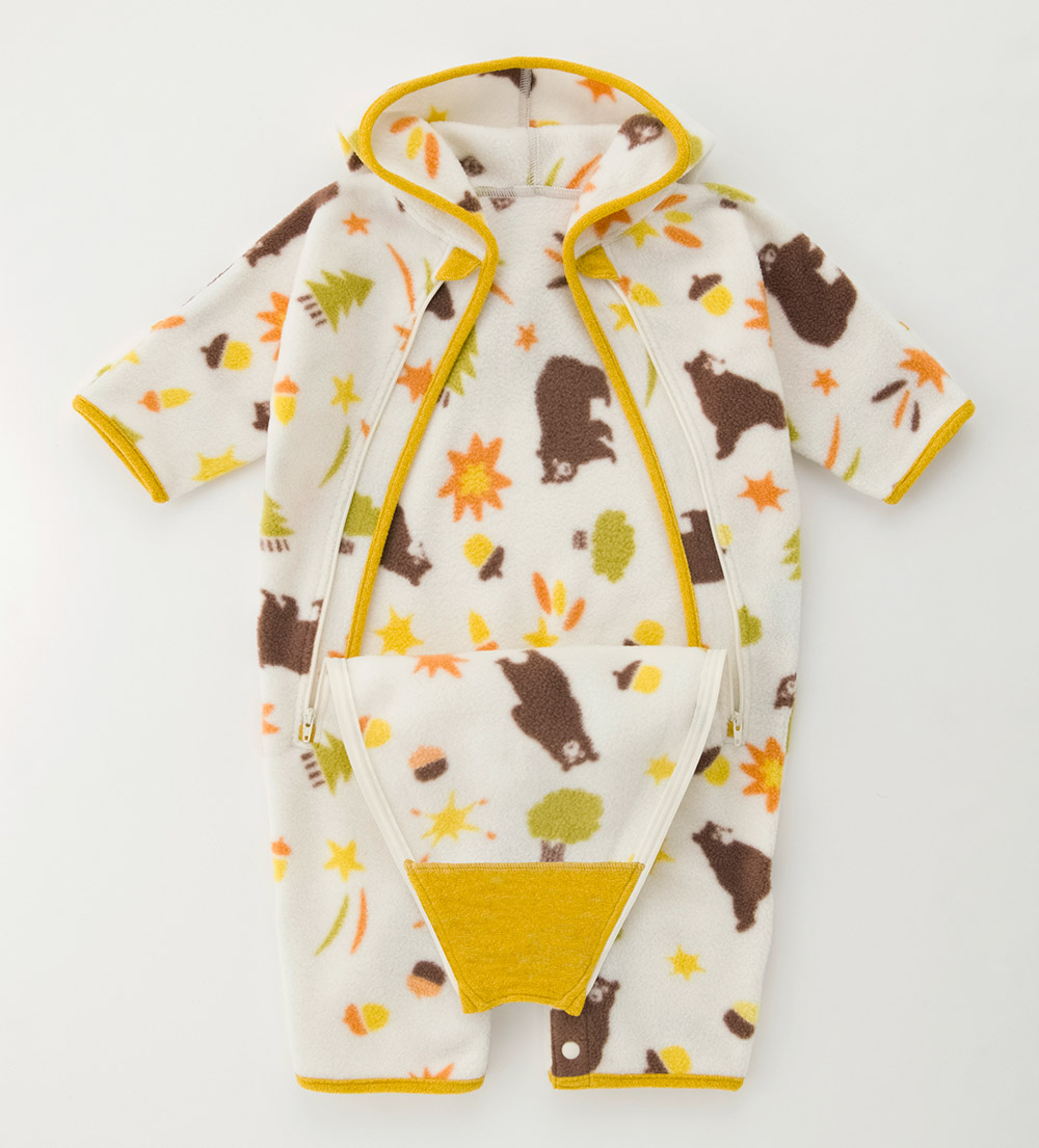 保温性とストレッチ性に優れる薄手のフリース素材「クリマプラス®100」を使用したプリント柄のカバーオール。2本のフロントジッパーが大きく開くので、簡単に脱ぎ着させることができ、股下のスナップボタンを全開すればおむつ替えも簡単です。袖口と裾を折り返せば手足を覆える仕様で寒い時季のお出掛けに重宝します。
