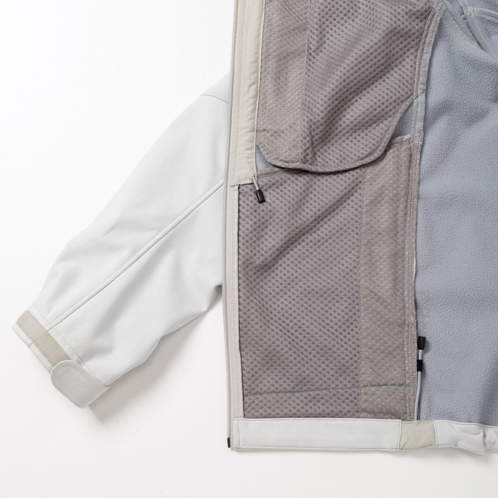 防風・透湿性フィルムを、シェル素材と暖かな起毛地で挟み、優れた保温性を実現した素材です。激しい運動に対応する、高いストレッチ性を備えています。