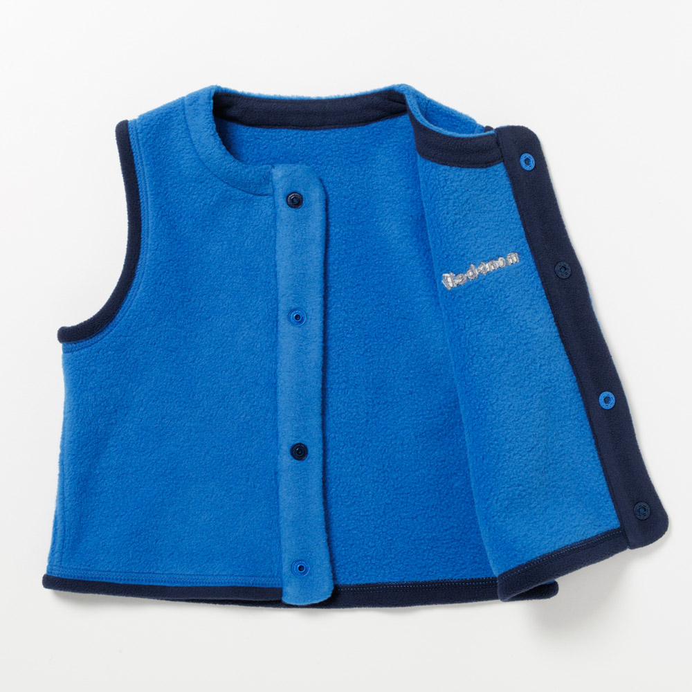 高い保温性を備えた中厚手のフリース素材を使用した、軽く暖かなベストです。フロント部はスナップボタンで脱ぎ着させやすい仕様です。重ね着しても干渉しにくいシンプルなデザインで、中間着やアウターとして幅広く活用できます。