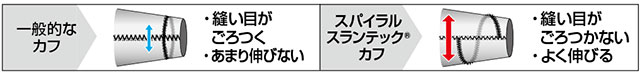 袖口の縫い目を斜め(スパイラル状)にすることでよく伸び、肌あたりの悪さや不快な締め付け感のない快適な着心地を実現しています。