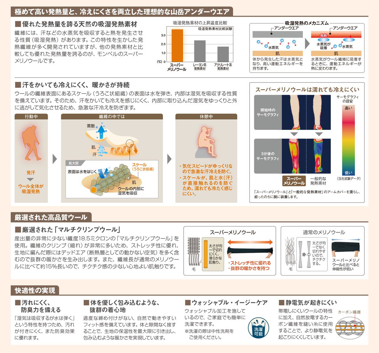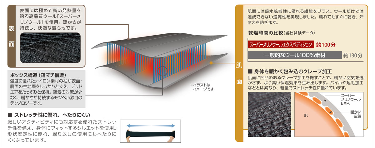 卓越した発熱量を誇るスーパーメリノウールに速乾性をプラスした、モンベル独自のアンダーウエアです。デッドエア(断熱層としての空気)を保持するボックス構造を採用し、身体を包み込むような暖かさが持続します。首元が暖かなジッパー付きハイネック仕様です。