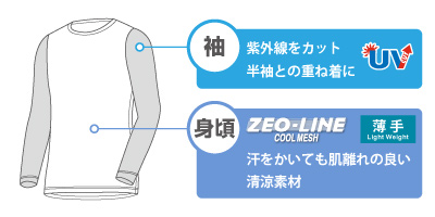 夏の日焼け対策に適したアンダーウエア。身頃と袖で異なる特長を備えた素材を使用しています。身頃は優れた通気性と速乾性を備え、暑い季節でも爽やかな着心地のジオライン®クールメッシュを使用。袖は高いUVカット効果を備え、締め付け感のない極薄手のストレッチ素材を使用しています。半袖Tシャツなどと組み合わせて、不快な汗のベタつき防止に効果を発揮します。