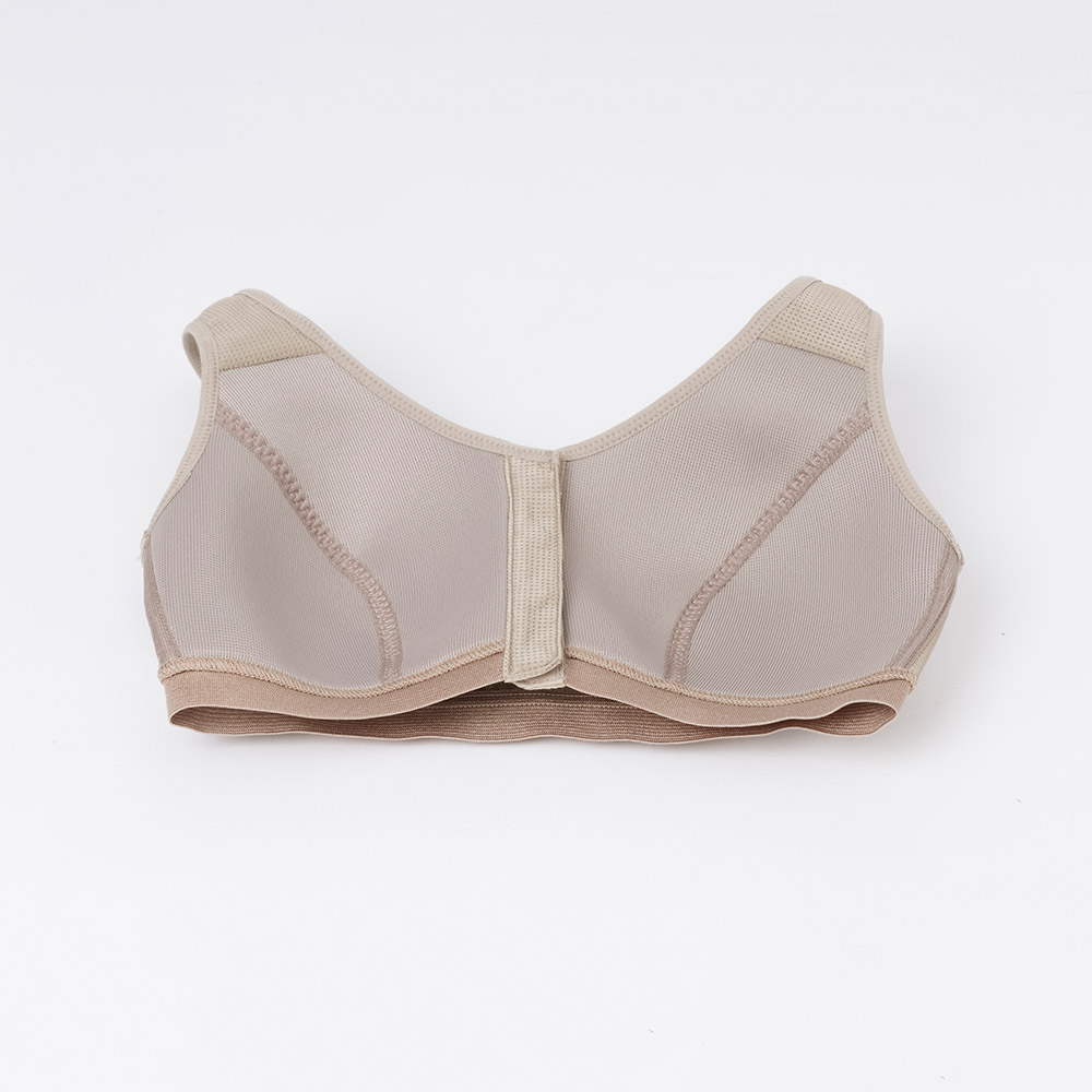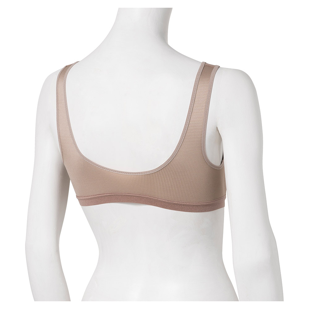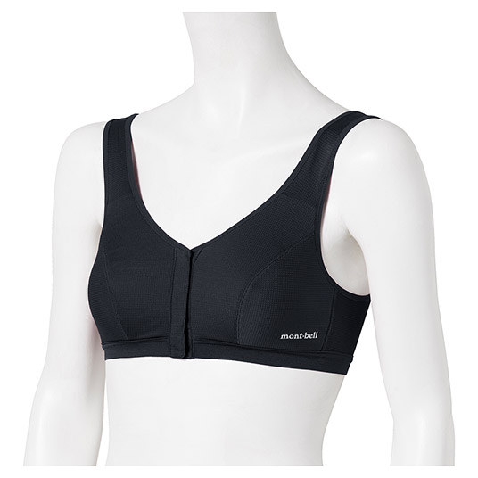 通気性やストレッチ性に優れたジオライン®メッシュを使用したブラです。肩紐がずれにくいパターンで仕上げ、通気性の高いパッドを備えています。着脱しやすく、ホールド力の高い縦ホック仕様です。