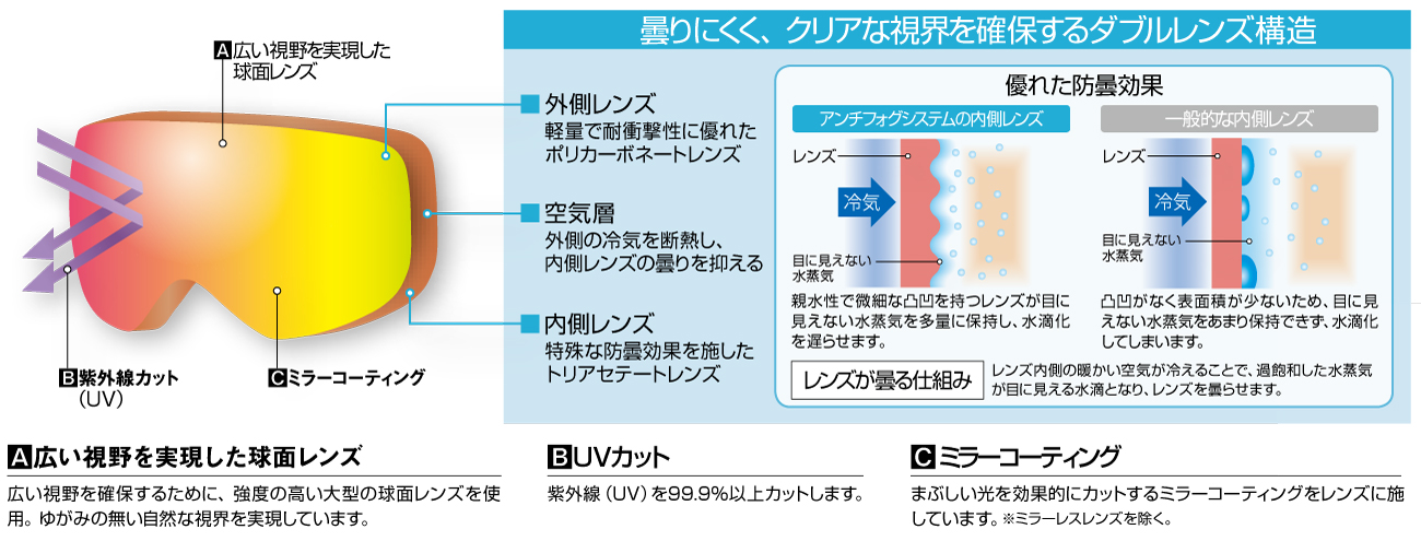 多数の日本人の頭部形状データを基に設計されたフレーム構造です。欧米人向けに設計されたゴーグルに比べ、顔との間にすき間ができにくく、呼気や冷気の侵入によるレンズの曇りを低減します。