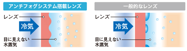 親水性で微細な凸凹を持つレンズが目に見えない水蒸気を多量に保持し、水滴化を遅らせます。