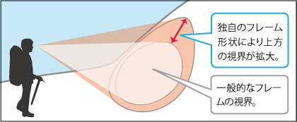 上部が広いフレーム形状です。登山中に重要な上方の視野が、一般的なゴーグルに比べて広くなっています。