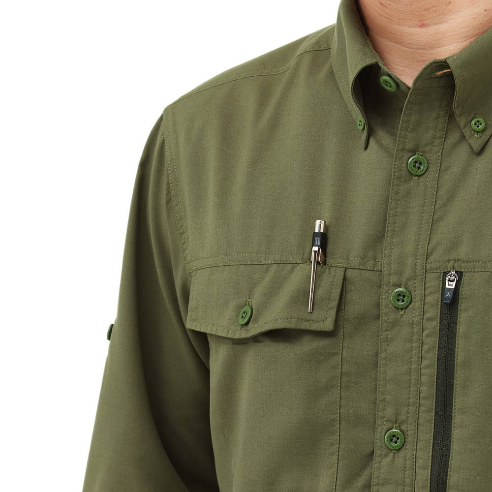 【特長】ポケット2個(ジッパー付き左胸1、フラップ付き右胸1)/ペンホルダー(右胸ポケット)/袖にロールアップボタン付き/UVカット
