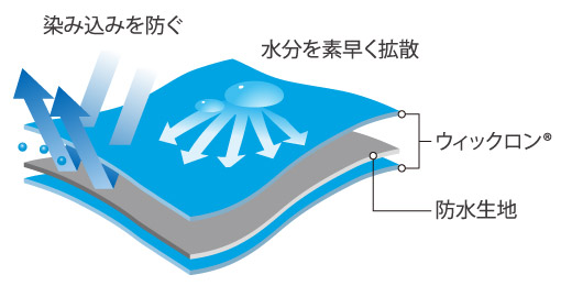 速乾性と通気性に優れたウイックロンの間に防水生地を挟み込んでいるため、よだれが衣服側へ染み込みにくくなっています。