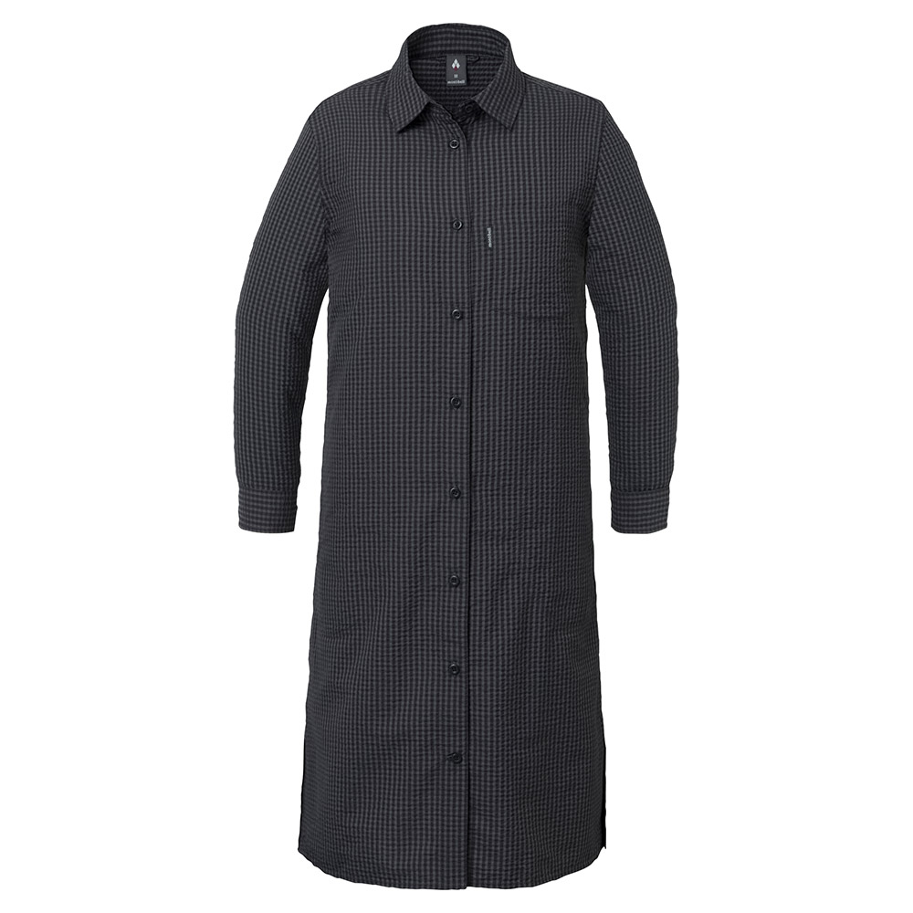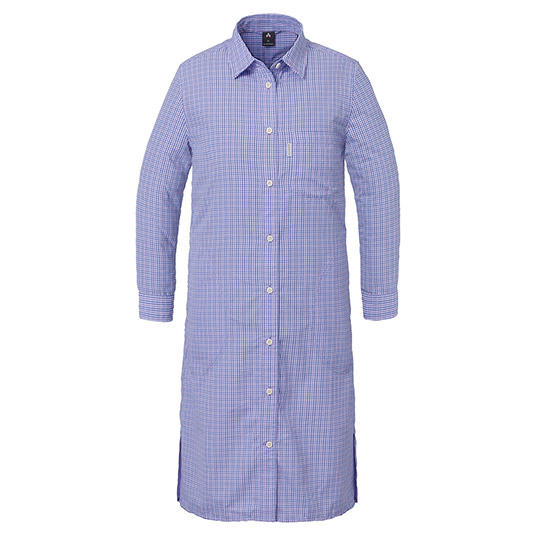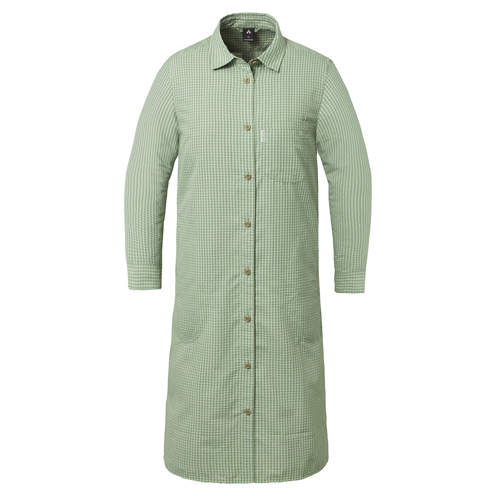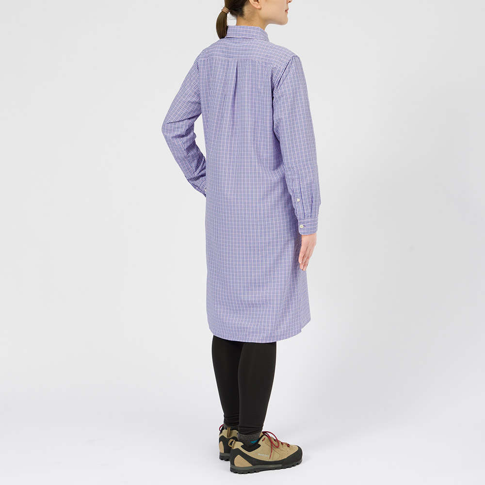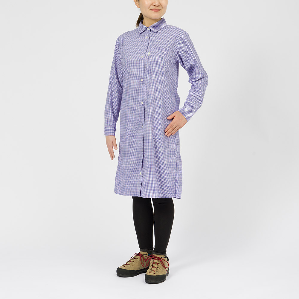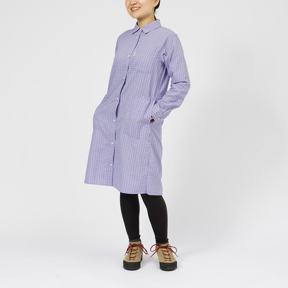 生地表面に独特の凹凸を持つサッカー地を使用し、タイツやパンツとのコーディネートに適したシャツワンピースです。生地と肌が点で接するため肌離れがよく、爽やかで涼しい着心地です。また、速乾性に優れ、シワになりにくく型くずれもしにくいため、長期の旅行にもおすすめです。